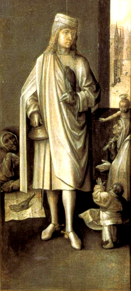 The few pre-modern images I have turned up show St. Bavo as he was either before or in the process of his conversion. At right, for example, we see him dressed as a 15th century aristocrat. In the Bosch painting below it, he is giving away his wealth to the poor but still in his expensive clothes and still carrying on his wrist the falcon that serves as his attribute. Prepared in 2014 by Richard Stracke, Emeritus Professor of English, Augusta University, revised 2015-09-15. |