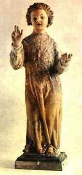 This is the underlying statue of the Infant Jesus of Prague. On display it is always dressed in fine garments, wears a crown, and holds an orb in the left hand.