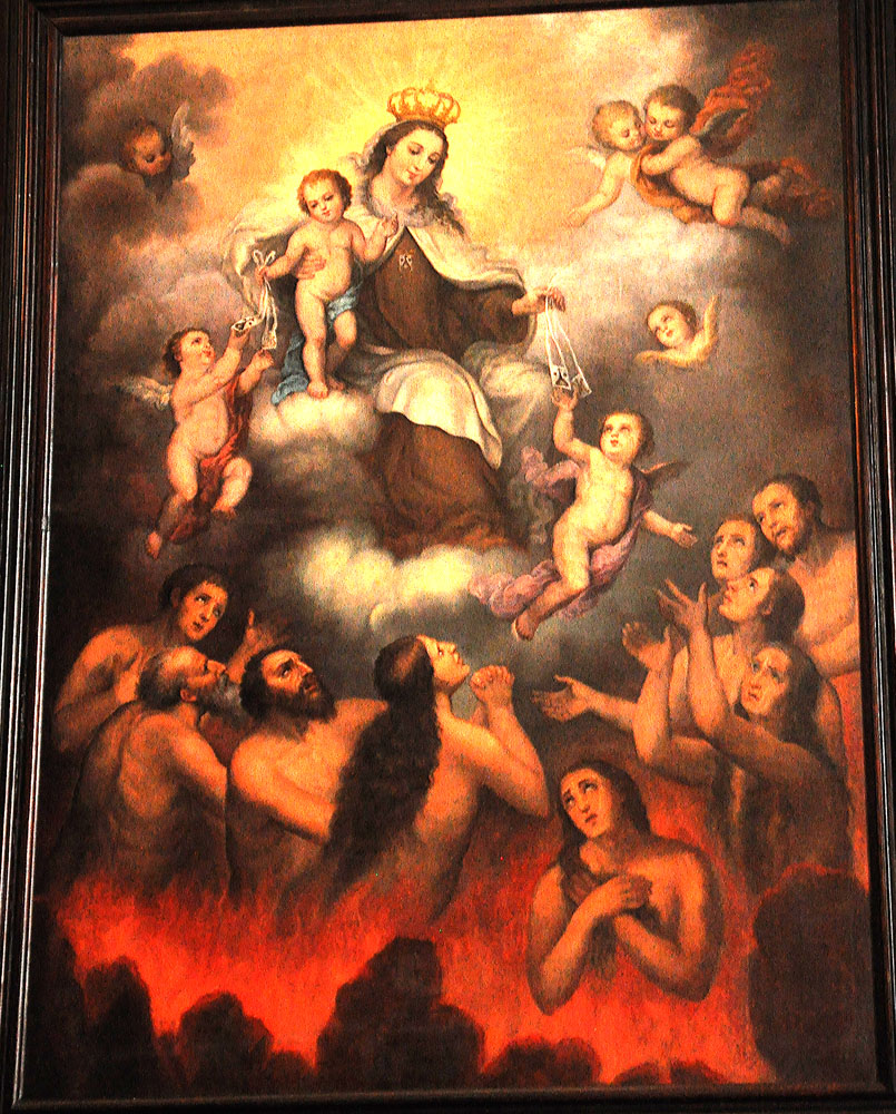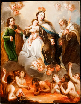 Our Lady of Mount Carmel is the patroness of the Carmelite order. Their tradition has it that the Virgin gave the brown scapular to St. Simon Stock. For some time the order maintained that Our Lady of Mount Carmel would rescue those who wore the scapular from Purgatory. For this reason, the lower sections of many images picture souls in Purgatory looking up to her for succor, as in the second picture at right. Mount Carmel is where Elijah called down fire from Heaven (I Kings 18:20-40), so in the 12th century a monastery was established there. It eventually had sister institutions throughout Europe that encouraged devotion to Our Lady of Mount Carmel. Because of the connection with Elijah, he sometimes appears in her images, such as the third picture at right. NAMES