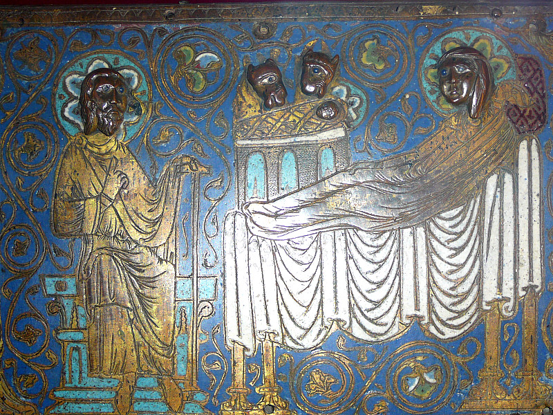 Other details diverge from the usual by suggesting church architecture and furniture. Joseph stands before what one can only read as an altar. The manger is supported by a structure like a stylized church, built of stone and with three slender windows. The legs of Mary's couch look like candlesticks, and the bedclothes drape down in the manner of a curtain, like the curtain of the Jerusalem Temple with which she is associated in the apocrypha.