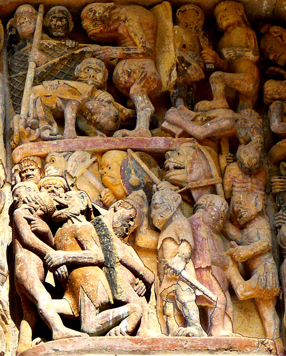 Below on the left a demon kneels in mock reverence as he attacks an unjust king. The artist has put this king in parallel with the just king Charlemagne on the other side of the tympanum: their beards and crowns are similar, and both are being led by the hand.