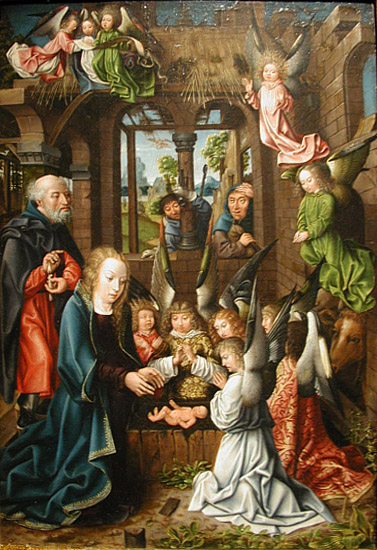 This painting exemplifies the influence of the Bridget of Sweden's vision in the Bethlehem cave. Mary kneels to the naked child while Joseph brings in a candle (Prophecies and Revelations, VII, 21). Later the shepherds came and "adored him with great reverence and joy" (ibid., VII, 23). The angels, however, are not in Bridget's vision.