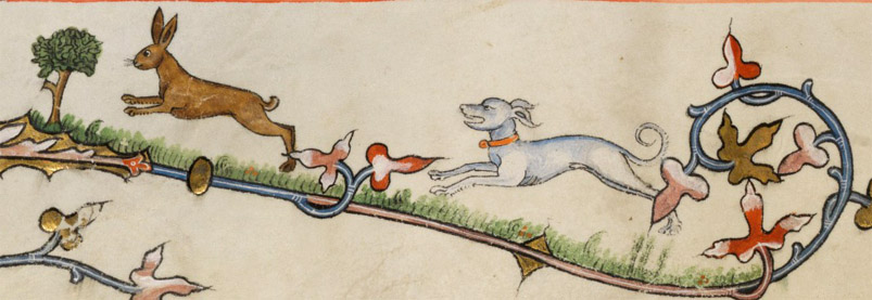 At the base of the page, in counterpoint to the saints in Heaven above, a leaping hare is pursued by a greyhound. (See below.) This illustrates a chapter on hares in a group of medieval bestiaries. These describe the hare as "light-footed" but present it in a negative light as representing people who are "inconstant" and "doubleminded" (Dines, 75).