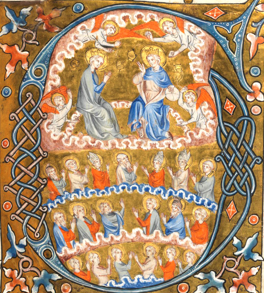 The text on the page contains the beginning of the hymns for the Feast of All Saints. Accordingly, saints of various kinds in the lower half gaze up to Christ and the Virgin Mary, who wear identical crowns and sit amid angels with censers. Their "throne" is merely a cloud-like meander.