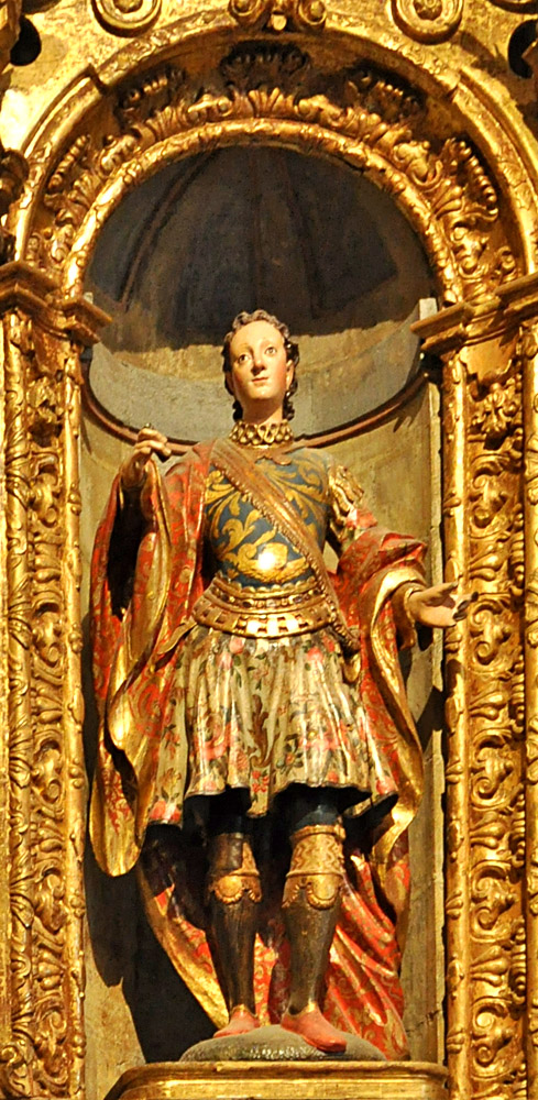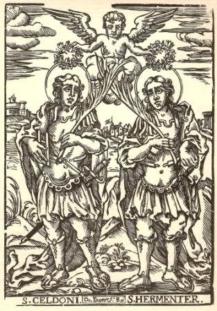 The various legends all say that upon their death the handkerchief of one brother and a ring of the other were taken up into the heavens. One would think that the ring and handkerchief would serve as attributes, but in most images they are identified only by their youth, their military garb, and the fact that there are two of them of similar countenance. In the first picture at right it is possible that the thing in Emeterius's left hand could be a bit of cloth, but Chelidonius holds something that looks like a miniature ladder. There is no ladder in these martyrs' legends. Prepared in 2018 by Richard Stracke, Emeritus Professor of English, Augusta University. |