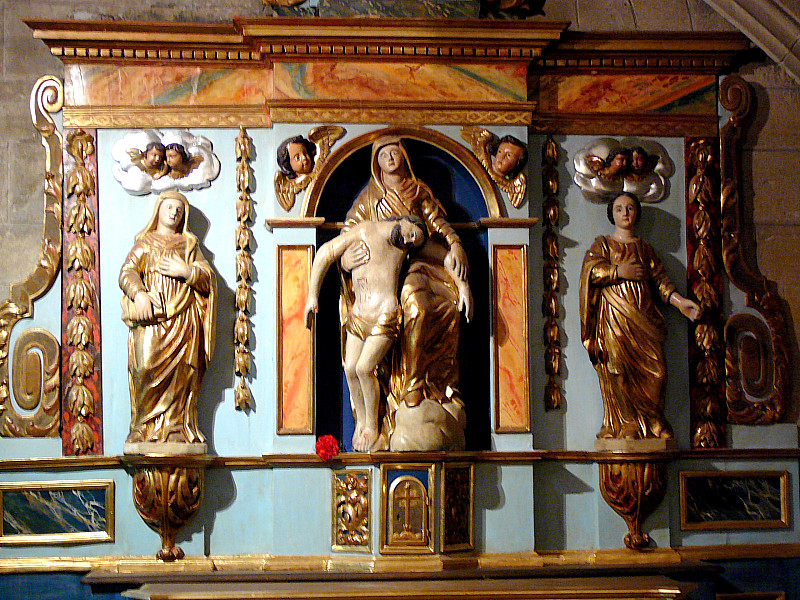 Directly below the Pietà sculpture is the altar's tabernacle. I have not identified the saints on the right and left.
