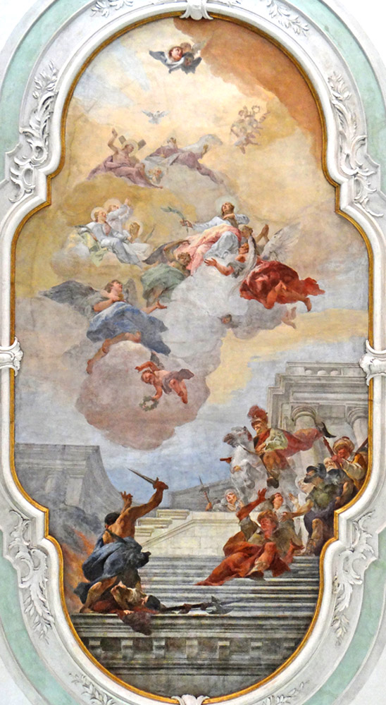 In the first scene in the painting Asterius describes a judge who looks down severely from his throne on the blushing virgin, whom the artist has dressed in the pallium and dark tunic of a philosopher. In the next scene one executioner pulls her head back, a second forces her mouth open, and a third pulls out her teeth as blood flows from her mouth. In the third scene she is in prison, lifting her hands to a vision of the Cross. In the fourth she stands enveloped in flames, "rejoicing as she passes on to the blessed, incorporeal life." Oddly, the subsequent iconography of Euphemia derives not from the ekphrasis but from an 8th-century passio Passio: An account of the suffering and death of a Christian martyr. by John the Stylite. The passio has some of the features that came to be familiar in accounts of virgin martyrs: speeches vindicating Christian monotheism, a named judge (in this case one Priscus) who reacts with growing wrath to the virgin's stubbornness, and a series of attempted executions or tortures miraculously averted. John's account puts Euphemia into a fire as the ekphrasis did, but for John this is just one of many attempts thwarted by divine intervention. At the end she is taken to the arena to be eaten by lions, but they simply lick her feet while one of them gently nips her shoulder. At that a voice from Heaven calls, "Ascend on high, O Euphemia!"2 Early in the 7th century the Emperor Heraclius removed the sarcophagus to Constantinople, lest it fall into the hands of the advancing Persians. But in the mid-8th century it was tossed into the sea by Iconoclasts. Those rejecting veneration of religious images and relics of saints. Then, according to texts collected in the Acta Sanctorum, God let it float safely to the island of Lemnos, whence it was returned to Constantinople after Iconoclasm had been suppressed.3 ![]() (See the description page.) PORTRAITS In portraits the lion becomes one of Euphemia's attributes, as in the first image at right. That image also shows a sword stuck in her breast. This refers to the way the Golden Legend's version ends: The lions' gentleness enrages Priscus, so a bystander finally dispatches the saint by thrusting a sword into her breast. (Death by the sword is a common trope in virgin-martyr stories, as is another feature of the Golden Legend's account, sexual humiliation.)No extant image has Euphemia in the philosopher's tunic and pallium mentioned in Asterius's ekphrasis. In 6th-century mosaics she wears the garb typical of female saints: a white veil, a gold-colored dalmatic with a jeweled or embroidered collar, and sometimes a jeweled coif (example). In later Orthodox icons she holds a cross and wears a maphorion A hooded upper garment often with a neck hole like the Virgin Mary's. In the West the garb varies. NARRATIVE IMAGES Narrative images are very rare. Jameson's 1879 survey of Euphemia's iconography discovered none at all, but in 1935 a photographer found a fresco series based on John the Stylite's account in the ruins of a church in Istanbul.4 The lions episode is pictured in a Croatian cathedral (the second picture at right) and in this stained glass window in Milan.Another narrative (or not-quite narrative) image is the ceiling fresco at Sant'Eufemia in Venice (third picture at right). It shows the saint ascending to Heaven from a place of martyrdom, but the person being slain in that place is someone else, a man who lifts his hand with the index and middle fingers raised to affirm the doctrine that there are two natures in Christ, human and divine. It was at Euphemia's church in Chalcedon that an Ecumenical Council reaffirmed this doctrine in 451 and condemned the "Monophysite" alternative that Christ had only a divine nature. According to legend, the two doctrines were written on two booklets and placed on Euphemia's breast in her sarcophagus; after three days of fasting and prayer the Monophysite booklet was found at the saint's feet and the Orthodox one in her right hand. During the ensuing centuries as controversy continued between Monophysites and Orthodox believers many churches along the Adriatic coast were consecrated to St. Euphemia as a way of declaring which side they were on. The Venice church was one of them.5 The Golden Legend claims that Ambrose of Milan (340-397) wrote in a "Preface" that Euphemia "was plucked unhurt from the fiery furnace" and then thrown to the "wild beasts," who "turned gentle and bent their heads."6 This seems unlikely, as these details reflect the account in John the Stylite and are at variance with what the Chalcedonians probably knew about Euphemia's martyrdom. Prepared in 2014 by Richard Stracke, Emeritus Professor of English, Augusta University. Revised 2015-11-01, 2016-12-28, 2017-05-14, 2017-12-19. |