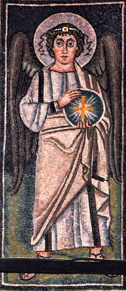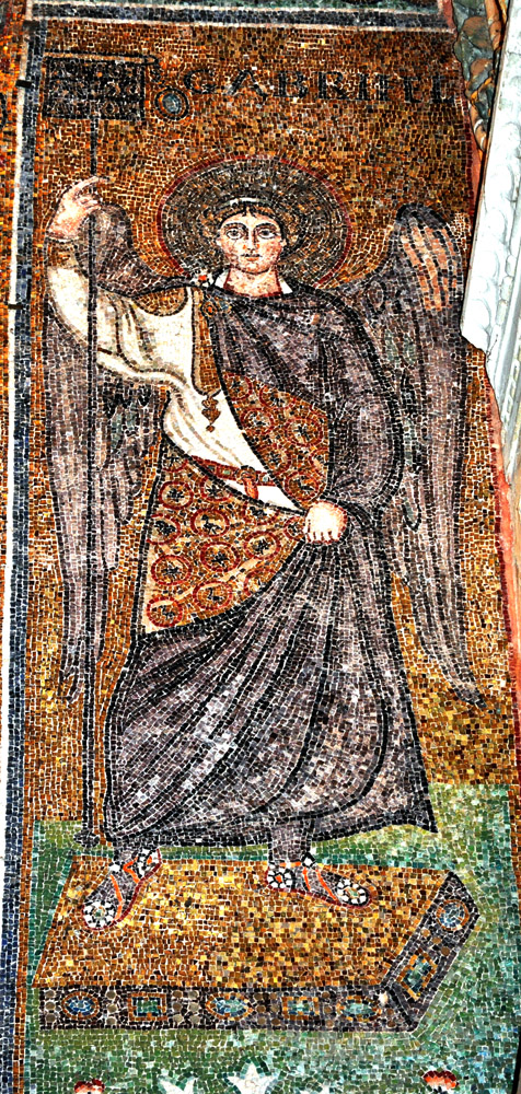 ![]() A 12th-century mosaic of Gabriel in an Orthodox churcch in Palermo, Sicily. (See the description page.) ![]() Gabriel and Michael are pictured as imperial officials carrying labara and flanking the presbytery at Sant'Apollinare in Classe. (See the description page.) ![]() A mosaic portrait of Gabriel with a clipeus from the mid-6th century. (See the description page.) MORE IMAGES