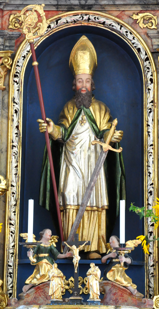 ![]() St. Lambert's attribute is a sword, referencing both the sword he threw away because he did not want to shed blood and the sword used soon afterwards to murder him. (See the description page for this image and the page explaining the iconography of images of this saint.)