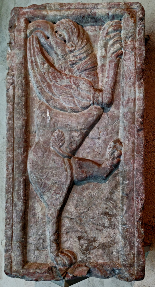 A late example of the satanic symbolism is outside St. Anthony's basilica, where two huge griffins grasp men and beasts in their paws (second picture at right). Perhaps the most notable example of the christological symbolism is in Dante's Purgatorio used the Griffin to represent Christ in the (cantos 29:106-114, 31:118-26). Griffins also appear in heraldry. In the first picture on the right, of a broken fragment from a French monastery, the griffin could have been intended either as a symbol of Christ or as a heraldic reference to a sponsor.