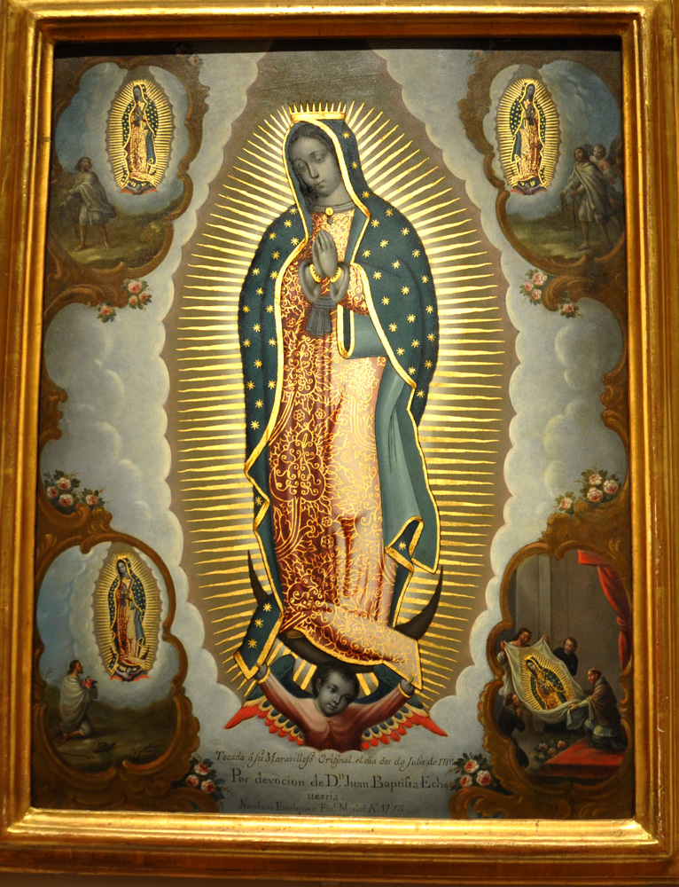![]() A typical Guadalupe santo in Tlaxiaco, Oaxaca, Mexico. (See the description page.) ![]() The four corners of this painting present the story of Juan Diego's vision and the tilma. (See the description page.) ![]() Putti hold the tilma above Christ and his cross while souls in Purgatory await their redemption. (See the description page.) DATES
