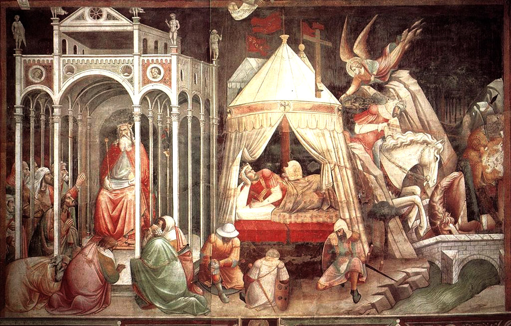 In its chapter for the Feast of the Exaltation of the Holy Cross, the Golden Legend recounts the story of the return of the Cross to Jerusalem after its capture by the Persians. The Persian king Chosroës had sacked Jerusalem and taken a part of the Cross back to his capital, where he had it placed by his side and demanded to be worshiped as a god. This is depicted on the left of the upper register of Agnolo Gaddi's fresco that follows the Legend's account:
