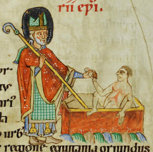 Portraits usually give St. Hilary episcopal vestments, a mitre and crozier, and a beard, usually white and often long. In the Golden Legend Hilary's first miracle was to restore to life an infant who had not been baptized. This event is pictured in the manuscript illumination at right. Prepared in 2014 by Richard Stracke, Emeritus Professor of English, Augusta University |