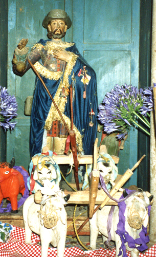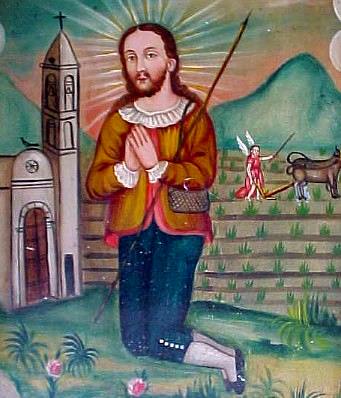 THE ANGELS AND THE OXEN The miracle for which Isidore is most renowned was observed by Juan Vargas one morning. The other workers had complained that Isidore was spending most of the morning at prayer in church each day, but when Vargas asked him about it Isidore assured him that his prayers would make the land more fruitful and that all his work would indeed get done. Vargas wondered how the latter could be possible, so he went secretly one morning to observe. What he saw was two angels helping Isidore with the plowing, each angel leading a yoke of white oxen.In memory of this miracle, countless churches in Latin America have statuary groups with the saint leading a yoke or team of white oxen, as in the first photograph at right. Other churches display paintings like the second one at right, with the saint praying at church and the angels already at their plows. Various images use various combinations of the saint's traditional garb: a flat-topped hat, a short jacket with a broad white collar and white cuffs, pants reaching to the knee or mid-thigh, and stockings or leggings. The growing of maize is often featured in images of the saint in Mexico, where it is the primary native crop (example), and in New Mexico as well (example). WATER MIRACLES Sometimes Isidore is shown with a long rod or goad, as in the images at right. This refers both to the oxen miracle and to another story witnessed by Juan Vargas and related in the 17th century in Jaime Bleda's Vida y Milagros del Glorioso San Isidro (293). One day while visiting the saint Vargas happened to mention how thirsty he was. At that, Isidore directed him to a rocky place where it would not seem there could be any water. He struck the ground with his ox-goad, and a spring burst forth (image). This was the first of many occasions when the saint made springs available where none had been.A HOLY FAMILY In the modern age Isidore's marriage to María Torribia has been taken to exemplify to holiness of the Christian family. Thus a painting from 1805 (the bottom image at right) borrows from Holy Family iconography to stress the holiness of Isidore's family. (Compare it with this painting of the Holy Family by Andrea del Sarto.) Alonzo Cano's Miracle of the Well is a sort of family portrait, picturing the miracle narrated in María's vita (Bleda, 214): Their son Juan fell into a well and drowned, but Isidore and María knelt to pray and miraculously the water in the well rose up to the brim, carrying the living child with it.The couple's status as a "holy family" continues even in the 21st century. In Ohio, a newly formed Catholic parish boasts of being "the first parish of our diocese to be given married patron saints" in an About us page that summarizes the lives of Isidore and María. (The summary carefully omits the claim in Bleda [214] that after Juan died the couple chose to live as brother and sister.) Torrelaguna, near Madrid, honors María and Isidore with an annual romería in which the people accompany a yoke of oxen that pulls a wagon with statues of the couple to the hermitage where María lived after Isidore's death (photo).
