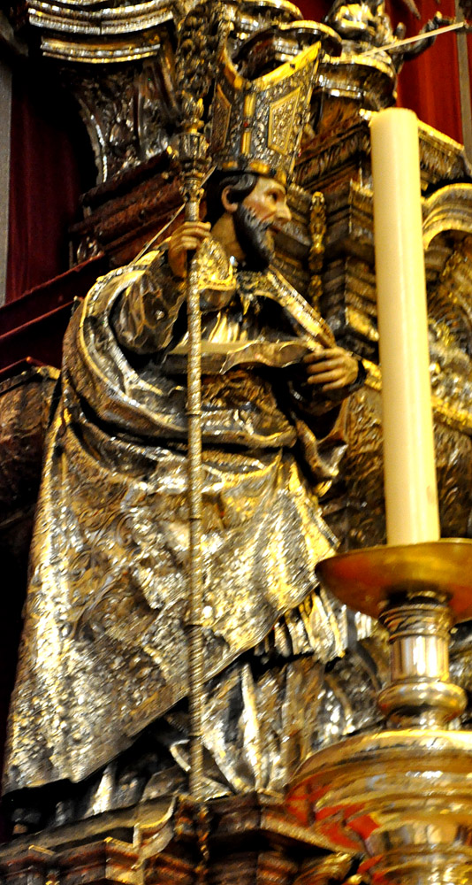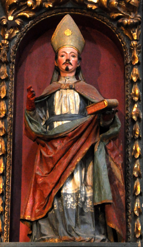 In portraits Isidore is traditionally pictured as at right, with a mitre, crozier, cope, and book – the latter in reference to his writings. He will often be paired with his brother Leander, as in the second picture at right. A number of portraits picture him at work writing the works on which his fame largely rests (example). In one late image he holds a volume of his revised liturgies while heretics and their books lie vanquished at his feet. Some images pair him with his brother Leander. A curious legend had it that when Isidore was a boy his father saw him from afar amid a swarm of bees attracted by honey pouring from his mouth. It seemed to the father that Isidore himself had taken the form of a beehive. On this basis he predicted that the boy would become a great teacher of doctrine.2 Bees and beehives thus are associated with the saint. An image on Wikimedia Commons labeled "Symbol of Isidore of Seville" without further explanation combines a beehive, crozier, and pen. Both Wikipedia and CatholicCulture.org say his symbols include bees or a "bishop holding a pen while surrounded by a swarm of bees." So far, I have not encountered such an image in my travels or on the internet. In later centuries Isidore was believed to have continued his promotion of the Spanish church by appearing in visions at key moments to encourage key figures, including Ferdinand III, whom he urged to pursue the reconquest of Seville from the Moors (example). A vita of St. Martin of León has Isidore appearing to Martin and setting him on the course of study that led to his authorship of commentaries on scripture (image).3 Prepared in 2018 by Richard Stracke, Emeritus Professor of English, Augusta University. |