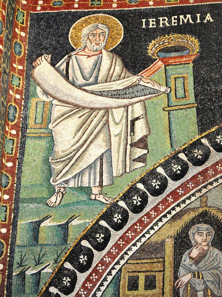 In the apse mosaic at San Clemente, Rome, Jeremiah looks up toward a scene of the Crucifixion holding a scroll that says, "Here is our Lord and no one but he shall be counted his equal." (See the description page.)