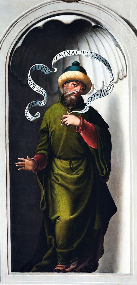 Jeremiah's denunciations enraged the king and his councilors. He was beaten severely and at one point cast into the a deep pit. When Jerusalem was in fact destroyed by the Babylonians, all its inhabitants either went into captivity in Babylon or took refuge in Taphnas (today's Tell Defenneh, Egypt), where tradition has it that they stoned Jeremiah to death.1 Many passages in the books of Jeremiah and Baruch were interpreted as foreshadowing Christian themes. So most images of the prophet will include quotations from those passages. In the first picture at right, for example, the banderole quotes a verse taken to foretell the Incarnation. Often portraits of Jeremiah are paired with one or more other prophets in the context of a single Christian theme. Thus Fra Angelico's great Crucifixion at San Marco, Florence, includes him among the eight Old Testament figures believed to have prophesied about Christ's crucifixion and resurrection. The second picture at right pairs Jeremiah's "Here is our Lord and no other is his equal" with a facing image of Isaiah's declaration, "I saw the Lord sitting above the sun." Both prophets are gazing up at an image of Christ on the Cross and thus asserting that the "Lord" they saw was Christ. Similarly, the third picture at right pairs Jeremiah with Moses in the theme of covenant. On one side of the mosaic God gives Moses the tablets of the Law in what he calls "my covenant." Christians referred to this as the "Old Covenant," whereas on the other side Jeremiah is associated with a "new covenant" that would replace the one that God made when he led the Israelites "forth from the land of Egypt" (Jer. 31:31-32). The large lunette between the portraits features Abraham and his covenant with God: the Lord's promise of offspring on his part, and Abraham's obedience on his. In the same way, the Aix Annunciation (below) pairs Jeremiah and Isaiah in the theme of the Incarnation. Both prophets were believed to have foretold that a virgin would give birth to the Redeemer. On the left is Isaiah, whose promise to King Ahaz that "a virgin shall conceive" was taken as a prophecy of Mary's virgin birth, and Jeremiah is on the right because his promise that the "virgin of Israel" would return to God was taken as a prophecy of the Incarnation.2