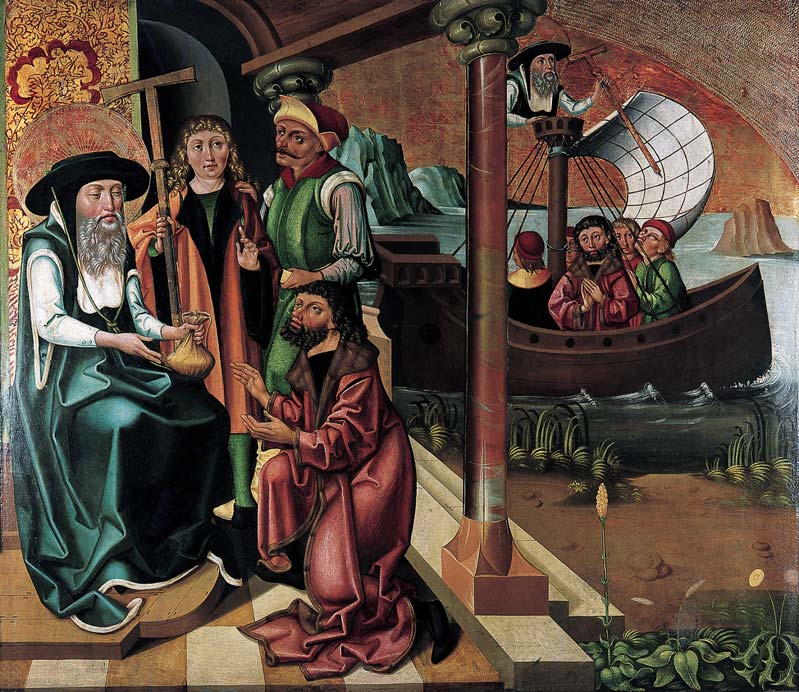 In the first picture at right the saint sits and distributes alms while sitting with a book in the open air. This is based on his vita's statement that "every Wednesday and Friday he had a seat and two stools placed in the open in front of the church and there he sat in company with a few virtuous men, or with the gospel in his hands." Most of his images show him giving alms, and they usually give him a white beard of serious proportions. He sometimes carries a staff with a "tau" top, as in the second picture at right. Prepared in 2017 by Richard Stracke, Emeritus Professor of English, Augusta University |