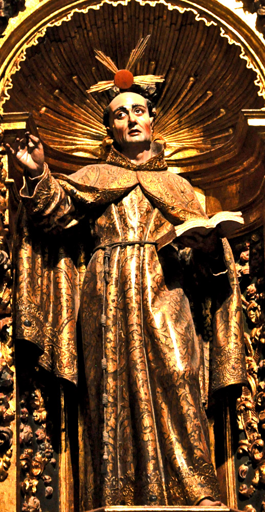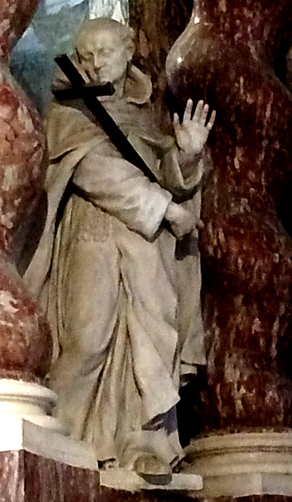 ![]() Zurbarán's portrait of St. John of the Cross, 1656 (See the description page.) ![]() A statue of the saint in a 1742 retable (See the description page.) ![]() Bernardo Falconi's statue in the Scalzi Church, Venice. (See the description page.) ATTRIBUTES