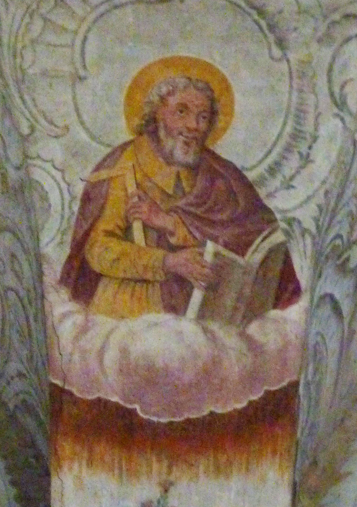 1. HALBERD OR CLUB As the Golden Legend tells it, Saints Simon and Jude were slain by pagan magicians enraged over the destruction of their idols. They ran upon the apostles and "hewed them to death."1. Lochner's painting shows the magicians doing the deed with broad swords, and one fresco in Germany uses a sword as Jude's attribute, but in all other images I have seen the attribute is either a halberd (as at right) or a club. In many cases the club is significantly broader at one end (example). The club or halberd could be related to the wand that the saint carries in a 5th-century fresco in St. Paul Outside the Walls.Unfortunately, the apostle James the Less has a fuller's club as his attribute, which can lead to confusion. 2. IMAGE OF JESUS In the 5th-century fresco Jude also holds a white disk against his chest with some sort of picture on it. In the 6th or 7th century the Acts of Thaddaeus reports that Jesus made an image of his own face by wiping it on a cloth and sent it to King Abgar of Edessa, who had expressed his faith in him. There was already a story in Eusebius' 4th-century History of the Church that Jude visited Abgar after the Ascension, so it is no surprise that Jude came to be associated with the picture of Jesus. In the second picture on the right is a wall painting of Jude presenting the cloth to Abgar. In portraits the cloth may be used as an attribute (example). In later Latin Christianity there is an iconographic type in which St. Jude looks directly at the viewer while holding a plaque with Jesus' face up to his chest. (See the third picture on the right.)3. FLAME In that western type of image a flame burns from the top of the saint's head. It might refer to the flames of which the Mesopotamian devils complain to Jude and Simon in the Golden Legend: "What will these apostles of the living God do to us? Lo! how we be burnt by flames in their entering into this city." Or it could reflect the fire imagery in the Epistle of Jude, where the author explains how to deal with "mockers": "some indeed reprove, being judged; but others save, pulling them out of the fire" (1:22-23).4. CARPENTER'S SQUARE Perhaps owing to a confusion with St. Thomas, on rare occasions Jude carries a carpenter's square or calipers (as in the last picture on the right). There is nothing in the Golden Legend to suggest that Jude did any kind of carpentry.Prepared in 2014 by Richard Stracke, Emeritus Professor of English, Augusta University. Revised 2017-02-05, 2017-12-01. |