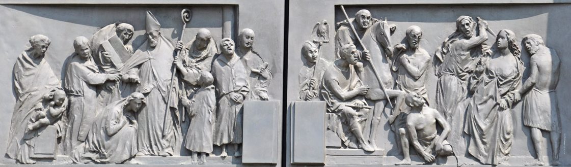 In the Christian era the Field of Mars became the Prato del Valle, with the Abbey of St. Justina rising at its edge. The saint was well known in late antiquity. In the 6th century the Paduans dedicated a church to her and she is portrayed among the virgin martyrs in the presbytery arch in the Euphrasian Basilica and in the procession of virgins in Sant'Apollinare Nuovo. In the 7th century, Venantius Fortunatus, writing in Gaul, urged travelers to Padua to visit her relics there.1 In the Middle Ages, she continued to be a favorite subject of portraits and narrative images in Padua and the rest of northern Italy. In the Abbey her martyrdom is the subject of the stunning 1576 painting over the high altar (third picture at right) and the 21st-century reliefs on the main door: ![]() St. Justina's feast day, October 7, happens to be the date of the Battle of Lepanto, in which the Turkish navy was decisively defeated by a "Holy League" comprising the forces of Spain, Venice, and most of Italy. In honor of her presumed intercession on behalf of the League, she is the central figure in this panel painted a few years after the battle. At times the images seem to confuse this St. Justina with the Justina who was martyred in the third century in Antioch (example). Prepared in 2017 by Richard Stracke, Emeritus Professor of English, Augusta University. Revised 2020-07-21. |