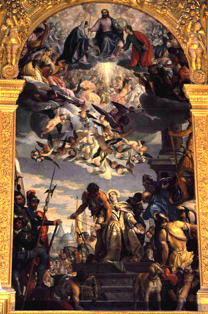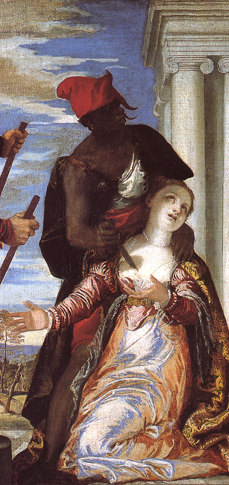 ![]() St. Justina's portrait in Mantegna's San Luca Altarpiece. (See the description page.) ![]() Center section of Veronese's 1573 Martyrdom of St. Justina. The marble bridge is in the background. (See the description page.) ![]() Another Veronese on the same subject, from 1576. Behind the saint and her executioners is the ground where her church will be built, and behind that the artist has painted the contemporary Basilica of St. Anthony. (See the description page.) ATTRIBUTES