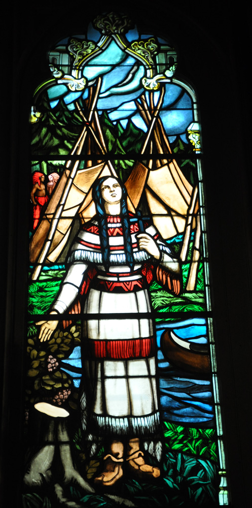 ![]() This painting of the saint by her spiritual advisor established the iconography that would be followed in subsequent images. (See the description page.) ![]() This statue in the Basilica Mission San Juan Capistrano gives the saint a lily stalk to reflect her title as "Lily of the Mohawks." (See the description page) ![]() St. Kateri as portrayed in a Montreal stained-glass window (See the description page) ATTRIBUTES