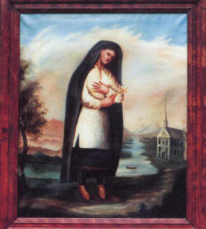 One of those authors, Claude Chauchetière, is also said to be the one who painted the first image of the saint, which hangs today in the mission church and is the source of St. Kateri's iconography (first picture at right). As in later images, she contemplates the cross and wears a short tunic over a long robe, leggings, and laced footwear apparently of deerskin. The dark mantle in the painting is replaced in later works by a short, fringed top – a common traditional garment among Mohawk women. The cross, fringed top, and laced footwear are the key elements in the iconography. Through the years the images reflect changing notions of how "Indian" a saint should look. In the Chauchetière painting her skin is light and her thin nose looks European. An 18th-century print based on the painting widened the nose and made the saint quite dark. ![]() Prepared in 2016 by Richard Stracke, Emeritus Professor of English, Augusta University. Revised 2016-09-11. |