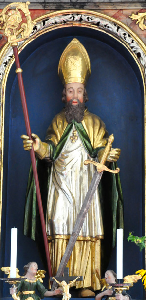 NARRATIVE IMAGES The second and third images at right capture the moment when the assassins rushed in on Lambert and his people while they were at prayer.PORTRAITS The saint is often pictured with just a mitre and crozier to indicate his role as a bishop, but when an attribute is added it will be a sword, as in the first image at right.Prepared in 2014 by Richard Stracke, Emeritus Professor of English, Augusta University. Revised 2017-06-25. |