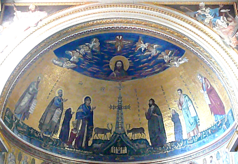 According to the Catholic Encyclopedia (s.v. "Saint John Lateran"), the figure of Christ with the angels is from the 5th century, possibly the 4th. Also from this period are the Cross in the center, the four rivers flowing from it, and the river scene along the bottom. The saints standing on either side of the Cross are from the 6th century; they were repaired in the 13th by Pope Nicholas IV, who is shown prostrate at the feet of the Virgin Mary. Also from the 13th are the figures of St. Francis and St. Anthony of Padua, who have been shoehorned in to the left of Mary and the right of St. John.