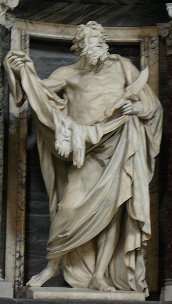 St. Bartholomew's is pictured with emblems of his martyrdom – a flaying knife and his own skin. This is one of twelve monumental statues of the apostles lining the nave of the basilica.
