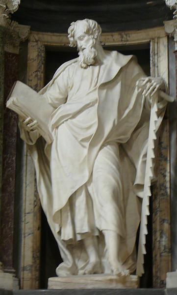This is one of twelve monumental statues of the Apostles, by various artists, lining the nave of the basilica. The bucksaw at St. Simon's left hand is his most common attribute.