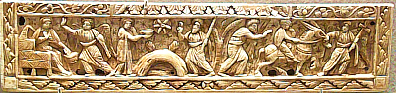 The middle of this piece represents the rarely illustrated episode of the water test (chapter 16 of the Protevangelium of James and chapter 12 of the Gospel of Pseudo-Matthew): the high priest disbelieves Joseph and Mary's explanation of her pregnancy, so he has Joseph drink "the water of drinking of the Lord," which would cause a sign of his mendacity to appear on his face. When no such sign appears, Joseph is acquitted. Then Mary is tested in the same way and also acquitted.
