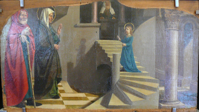 In the foreground group are St. Anne and St. Joachim, in the same beard and red hood he wears in the "Golden Gate" scene in the predella. The High Priest is at the top of the 15 stairs.