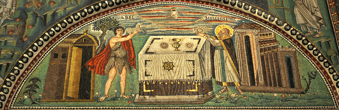 That verse is cited by the author of Hebrews, who made the ancient priest a type of Jesus Christ, the new high priest whose sacrifice takes away sin (Hebrews 7:1-28).1 Subsequent Christian thought extended this typology to Abel's sacrifice of a lamb and Abraham's of his son Isaac, notably in the Roman Catholic liturgy, which has included language linking the sacrifice of the Mass with those of Abel, Abraham, and Melchizedek since the 4th century.2 The 6th-century mosaic shown above references this typology by juxtaposing Melchizedek's sacrifice with Abel's and putting both at a table resembling a Christian altar. A similar 7th-century mosaic adds Abraham and Isaac to the altar scene. In an 11th-century portable altar, the lower edge features the sacrifice of Isaac; the middle, figures of Melchizedek and Aaron; and the upper edge, two Christian bishops. The priest saying Mass is thus kept mindful of the convergence between his own actions, the Old Testament sacrifices, and "the offering of the body of Jesus Christ once for all" (Hebrews 10:10). And a 19th-century altarpiece makes the same point by including Melchizedek among four Old Testament figures flanking the Crucifixion, which their sacrifices are believed to have prefigured. This typology also informs more literal images of Melchizedech's sacrifice – that is, those that follow the narrative in Genesis. In the first image at right Abram arrives with his army as Melchizedek prepares for the sacrifice with a basket of bread and a krater of wine; the typology is referenced by the figure of Christ above blessing the sacrifice. In the second, Tiepolo makes the sacrifice look much like a contemporary Mass: Standing before a full-size altar with a linen cloth, Melchizedek raises the bread just as a Catholic priest would elevate the host, while Abraham kneels in adoration. The third picture at right shows a neo-Gothic relief on a German altar. The typology has been emphasized by the unusual addition of Isaac at Abram's feet. The low stone altar is a kind commonly seen in earlier medieval images of this episode. As in the Tiepolo and many other images, Abram is dressed as a warrior. In another neo-Gothic work, the bread on the altar is one of five loaves brought by a boy kneeling behind Melchizedek, a reference to the Miracle of the Loaves and Fishes and Jesus' own typological explanation of that miracle (John 6:5-15, 27-34). A mosaic in Cefalù, Sicily, deepens the typology by returning to those assurances in Hebrews that Jesus' sacrifice takes away sin, enlisting a set of Old Testament prophecies about the salvation of Israel to suggest that the Christian faithful are "raised up on the third day" with Christ.