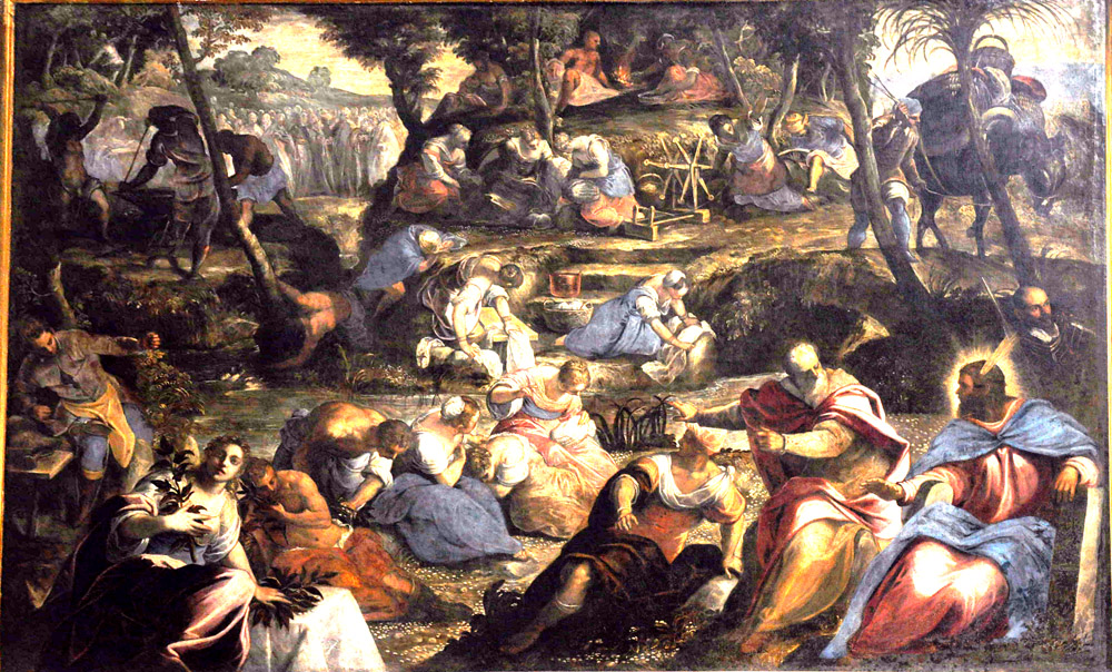 Many of the details of this painting are reprised years later in Tintoretto's Fall of Manna (1593), most notably the grisaille of a crowd in the far background, the prominence of women, the old men with long gray beards and pink mantles, the riverine setting with hills, and so on.