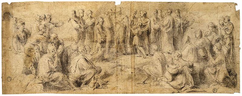 The separation of the crowd into two groups by gender was not unprecedented when Tintoretto did this painting. Compare this drawing of the same event from 1536: