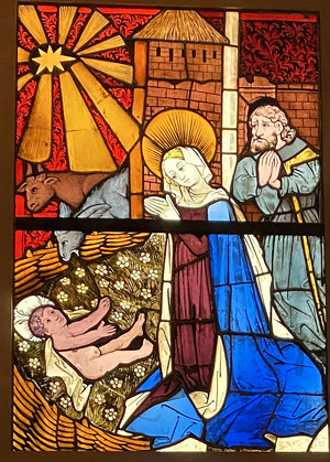 In this window fragment the ass is feeding on the flowers. In many other Nativities it is the child that the beasts appear to feed on, so the flowers may be meant to symbolize Christ himself.