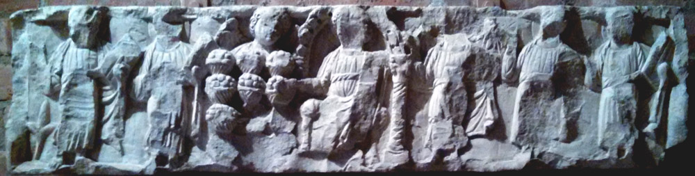 The gospels have six accounts of miracles involving the multiplication of loaves and fishes, but only in John does the crowd react with a characterization of Jesus as the Messiah: "This is of a truth the prophet, that is to come into the world."1 This recognition of Jesus' exceptional status is registered in the raised right hands of the four men in the relief and in the portrayal of Jesus not as a man addressing a crowd but as the Christ – seated on a throne, framed by an arch, and flanked by two angels.