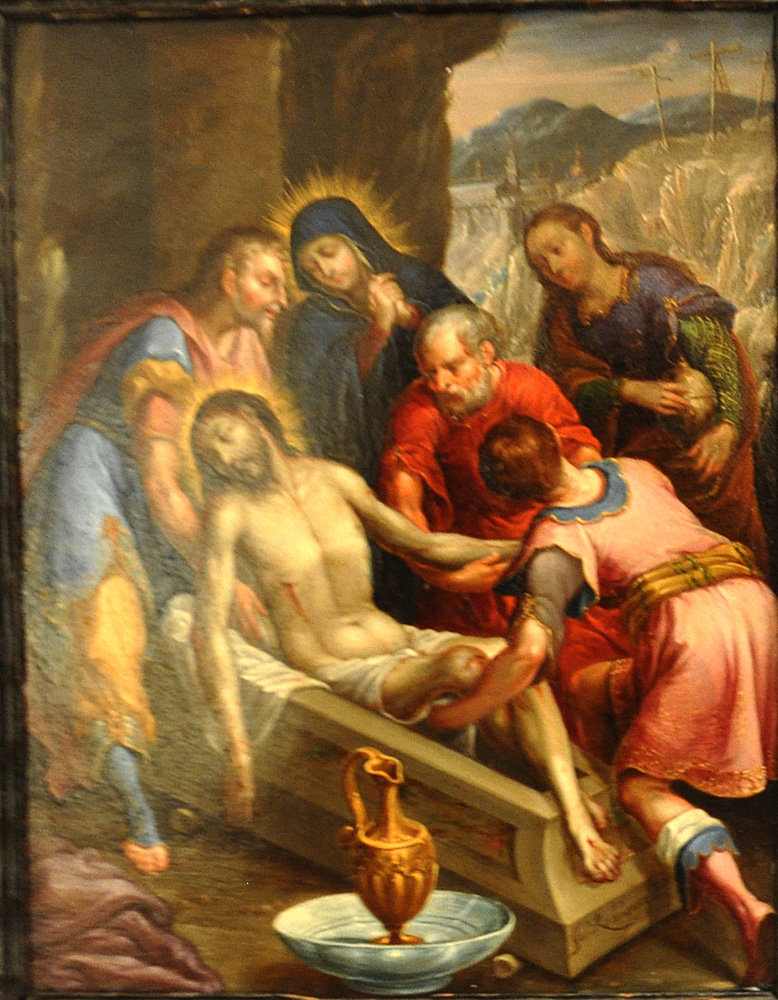 In the background are the Virgin Mary (blue mantle) and St. Mary Magdalene with her attribute, the ointment jar. The pitcher in the foreground refers to the ceremonial washing of a Jewish body and symbolically to the pitcher seen in Annunciation images. The three men laying the body into the sepulcher are hard to identify. Perhaps the one with red hair and a more diminutive frame could be St. John the Evangelist; the man on the left might be Joseph of Arimathea, whose tomb this was.