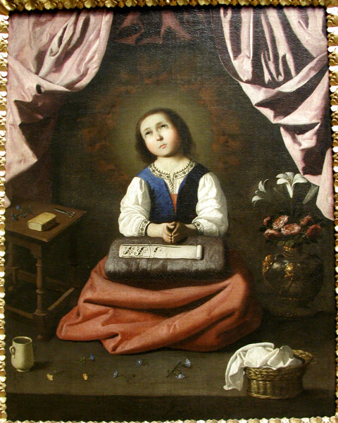 Mary is pictured "constant in prayer" with items related to "wool-work" around her: the roll of cloth on her lap, the basket, the scissors on the table. At the same time, the vase of flowers and the book foreshadow the Annunciation.