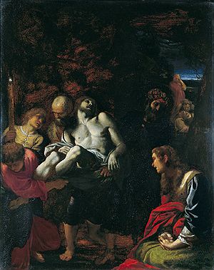 Carracci abandons the traditional iconography and applies the gospel accounts to his typically early-Baroque style. He pictures the men carrying the pallid body into the tomb and toward an offstage location. As in the gospels Joseph of Arimathea directs the work (e.g. John 19:38) and Mary Magdalene observes disconsolately. (Joseph is identified by the turban, the Magdalene by her long, blond hair and red mantle.) In an effect reminiscent of Nativity scenes after Bridget of Sweden, it is Christ's body that illuminates the figures and far outshines the little flame on the candle.