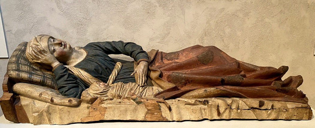 St. Anne lies beside her newborn child. Renaissance paintings of Mary's birth tend to be populated with a crowd of visitors, midwives, etc. Anne herself is often separated from the baby and relegated to the background. But in this sculpture she and the child lie serenely alone together.
