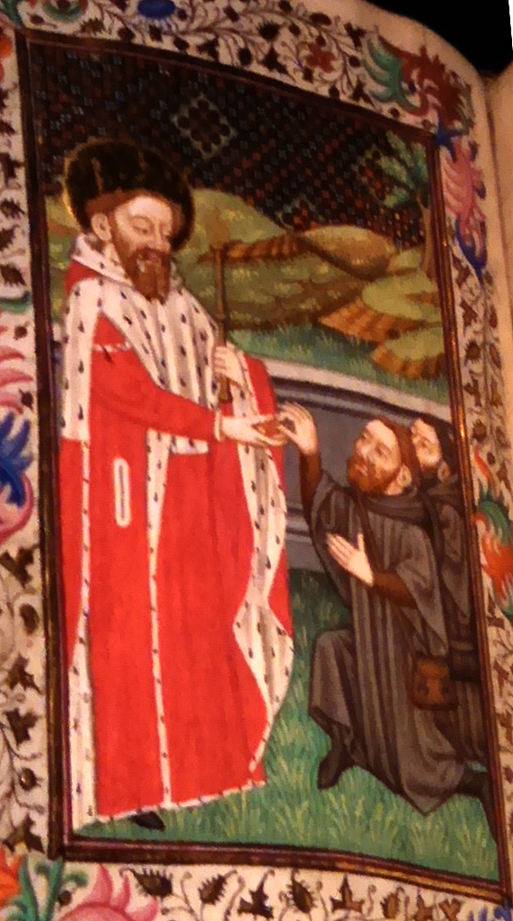 The king is seen giving his ring to a beggar who will later turn out to be St. John the Evangelist. The ring is Edward's attribute.
