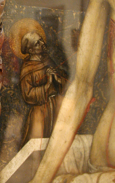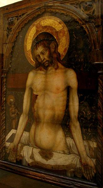 This iconographic type, also known as the imago pietatis, presents the viewer with an image of the visibly wounded Jesus standing in or on a sarcophagus. On the left a small figure of St. Francis receives the stigmata directly from Jesus' wounds.