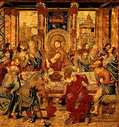 There is a bit of modern nonsense that the person leaning on Jesus' breast in so many Last Suppers is not St. John the Evangelist but St. Mary Magdalene, but this work portrays both figures. The "girlish" John leans into Jesus' breast while Mary Magdalene reaches for the jar of ointment.