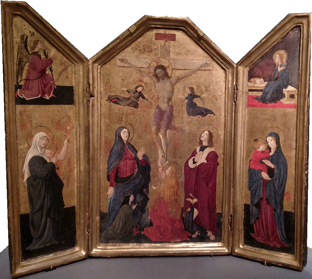 The central scene is typical of Crucifixions in this period, with Mary and John on the left and right, a Mary Magdalene with flowing blond hair kneeling at the foot of the cross, and angels collecting Jesus' blood in chalices.