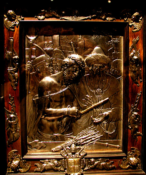 Putti on the outer frame carry the instruments of the Passion. Clockwise from the upper right they are the cross, the ladder and implements used to remove Jesus from the cross, the pole with the sponge (?), and the pillar where Jesus was scourged.