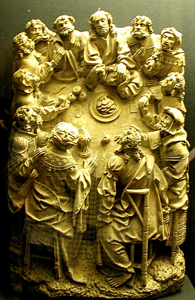 The museum's label says, "Possibly part of a large stone altar or retable, this Eucharistic scene, with tilted perspective, clearly shows each disciple, including Judas (lower right), clutching his bag of money, a reference to his future betrayal."