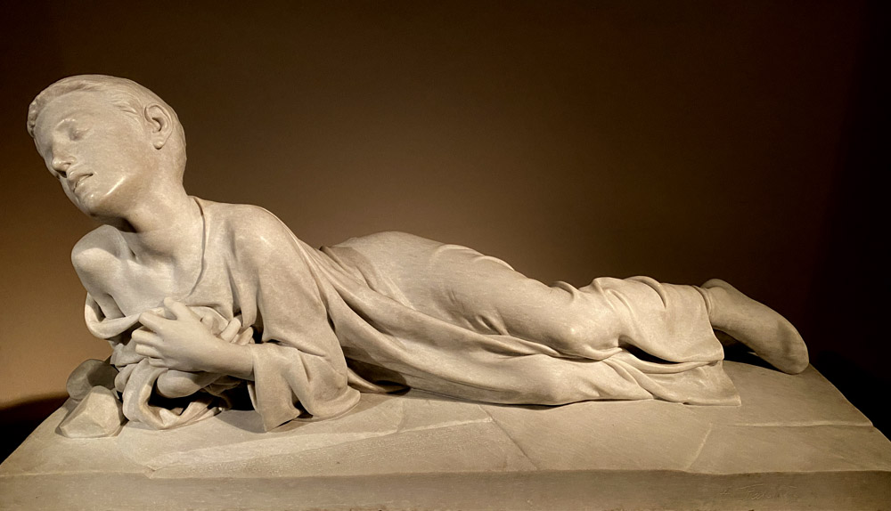Falguière's sculpture follows Wiseman in making Tarcisius a young boy and includes a few of the stones used to murder him. The stones do not appear in Damasus's poem, but they are implied by the comparison with St. Stephen and were added to the story in medieval retellings.3
